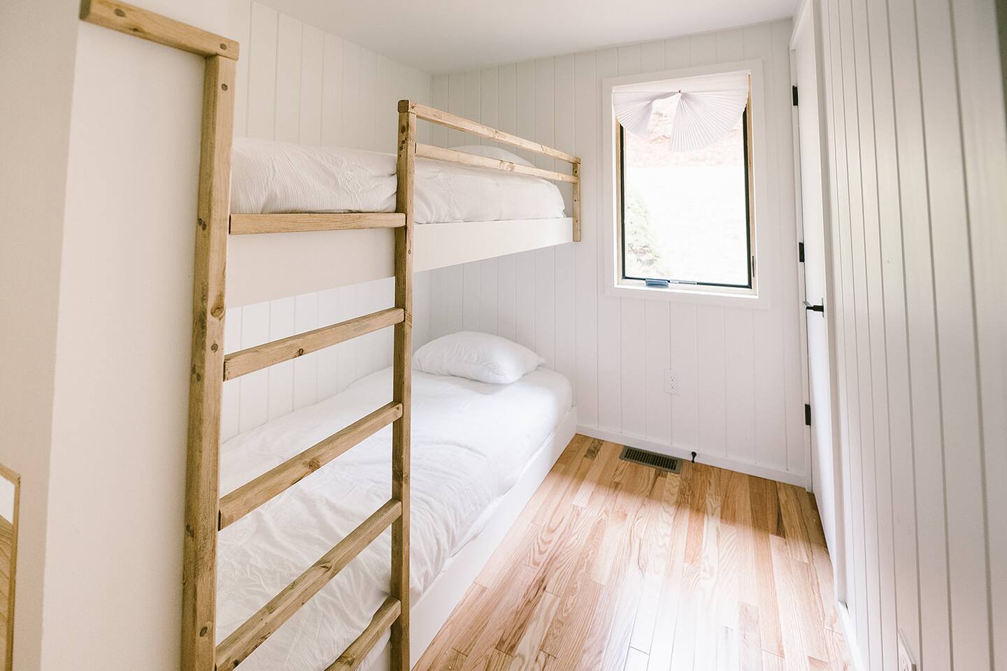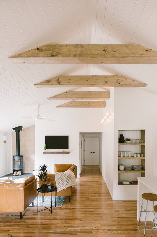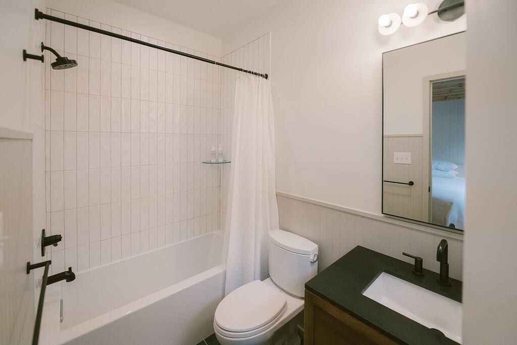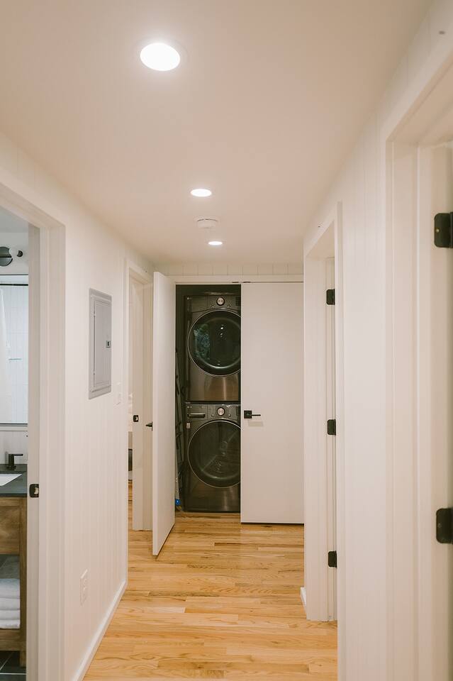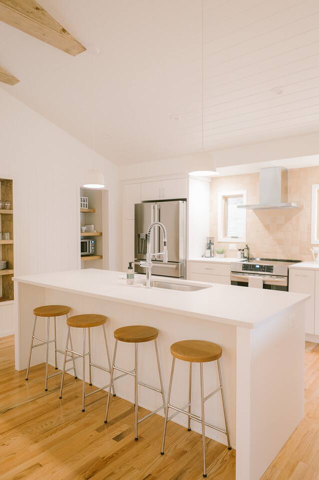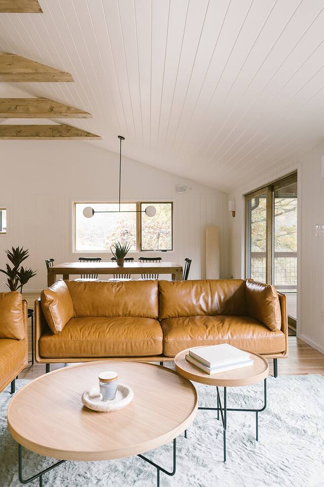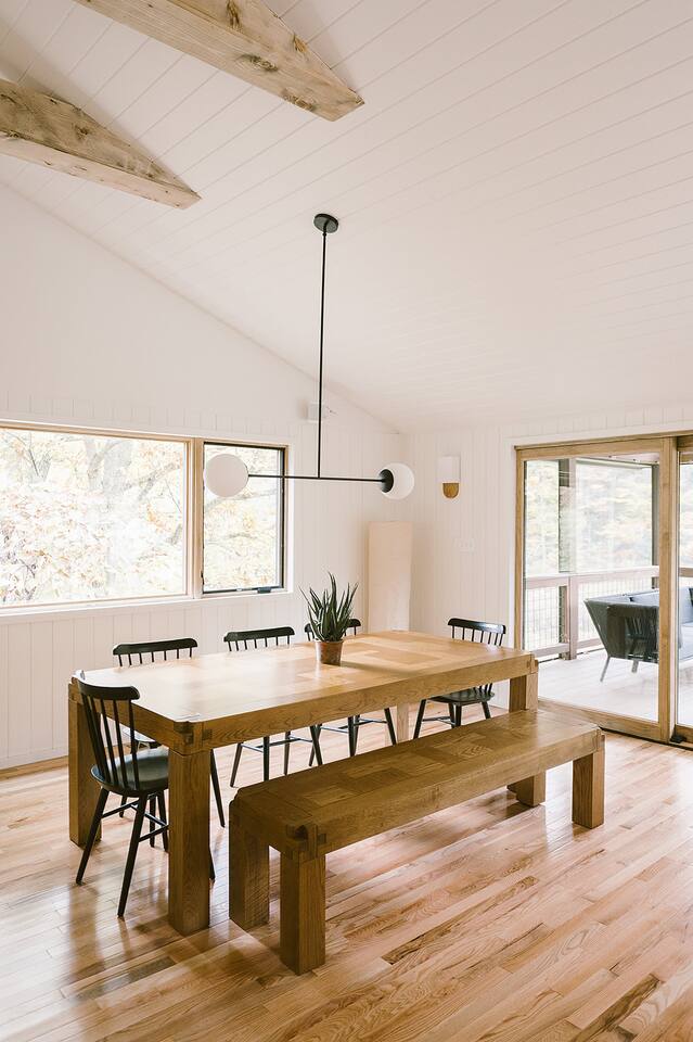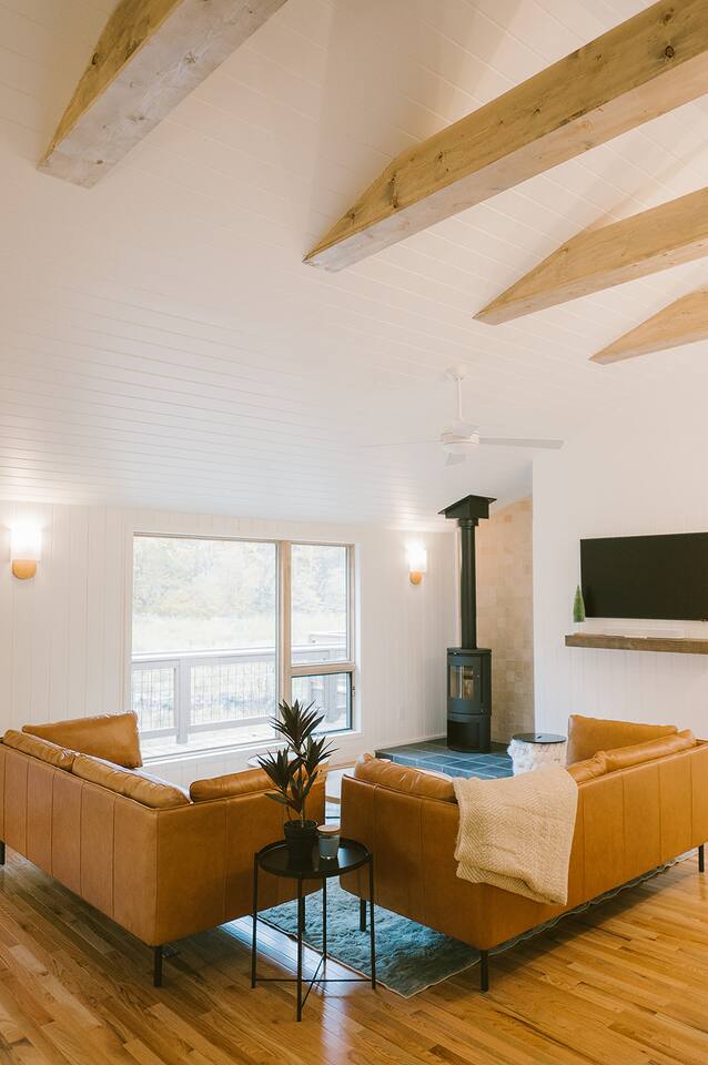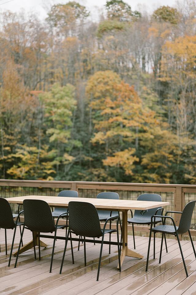 Meadow House at Wanderin Lands is a Scandinavian styled retreat designed with intention and simplicity. Fully renovated in 2022 as a getaway designed for 2 families with kids. The home is equipped with a full kitchen, extremely comfortable beds, high quality furniture, and amenities to slow down, cozy up and take in the beauty of nature all around. AT A GLANCE: 6 beds: 2 Queen, 4 twin Hot tub for 4 Barrel cedar sauna for 6 with meadow views Screened porch with sofa seating and sounds of the creek Large deck with outdoor dining for 8 Gas grill with propane provided Outdoor private shower Solo stove fire pit Deep soaking tubs in each bathroom Yoga mats (x2) and yoga blocks (x4) Laundry machines Fully equipped kitchen (w/ kids dishes, salt/pepper/oil/spices/sugar/tea) Coffee bar (multiple types of coffee makers) Induction stove Filtered drinking water Dining table seating for 8 Counter bar seating for 4 600gb Fiber Wifi Samsung gallery TV Hair dryers in bathrooms Sound machines in every room Black-out shades in each bedroom Pack n' Play travel crib with sheet Juice Box 40 EV charging station No Guest fees! LOCATION DETAILS 8 min to downtown Lansing 20-25 min to downtown West Jefferson & Jefferson 25 min to Ingles Grocery store 30 min to Grayson Highlands State Park 45 min to Boone 45 min to Whitetop trailhead of Virginia Creeper Trail 60 min to Damascus trailhead of Virginia Creeper Trail THE PROPERTY Wanderin Lands is 105 acres of land in beautiful Ashe County NC. A state maintained back country road runs through the property. Upon arrival you'll find our home accessible from a short gravel driveway directly off that road. Orchard trees and an arbor of grape vines line the driveway. Through the home, you'll take in views of our 16 acre meadow and hear sounds of the burbling creek at the treeline where the meadow rises to hillsides. Out back is a large deck and screened porch with cafe lights and outdoor speakers. The deck also houses the hot tub, barrel cedar sauna, outdoor shower, gas grill, and el fresco dining for 8. Beyond the deck is the solo stove fire pit and private A-frame cabin designed as a work/meditation/yoga space. Stretching to the west is a private grass trail that weaves around a portion of our 105 acres - out along the creek side and loops back to the house (about a .5 mile walk in all). THE HOME We appreciate the simplicity of Scandinavian design with its cozy minimalism to bring peace to the mind and refocus on the beauty of the surroundings. Thoughtful views from every window, dim-able lighting in every room, and comfortable furniture nurture rest and relaxation. Inside, our home provides multiple open areas to gather if visiting with family or friends, as well as private spaces to be alone and reflect. LIVING SPACES We have an open floor plan connecting our kitchen/dining/living spaces. Our fully equipped kitchen with island seating for 4, overlooks a large dining table for 8. The adjacent living space has two supple leather sofas that orient to views of the meadow and hillsides. When not taking in the views, our Samsung Gallery TV allows for streaming from all popular apps. Beyond the dining area through the glass sliders is our screened porch with 2 additional sofas for relaxing, reading or napping (our favorite). The porch and deck are outfitted with speakers and cafe lights. Enjoy soft tunes or the burbling sound of the creek while taking in the sunset or wildlife (red-winged blackbirds & deer) over the meadow. Occasionally you will also catch the sound of cars passing on the nearby road that carves through our 105 acre property. ROOMS All bedrooms have bright natural light in the daytime and blackout blinds for great sleep. Each room also includes dim-able lighting, ceiling fans, USB plugs, a sound machine with 10+ sound options for lulling to restful sleep. All rooms are purposely TV free and outfitted with plenty of storage — A closet in all bedrooms, dresser in each primary room, and cubbie cabinet in each bunk room. Beds were chosen for extreme comfort – Many of our reviews confirm this! Room 1 - 1 Queen Primary en suite with a private bathroom & deep soaking tub. Views to the southwest over deck, meadow, & mountainside. Room 2 - 1 Queen Primary en suite with private bathroom & deep soaking tub. Views to west over A-frame cabin and meadow. Room 3 - bunk room, 2 twin beds Cozy built-in twin bunks designed for kids with special nooks. In the closet you will find a Pack n' Play with crib sheets for your convenience + yoga mats and yoga blocks. Room 4 - bunk room, 2 twin beds Cozy built-in twin bunks designed for kids with special nooks. Designed by our friends, design-duo Jammy Pop, so much love and attention has been poured in to this space and we're thrilled to share it with you.