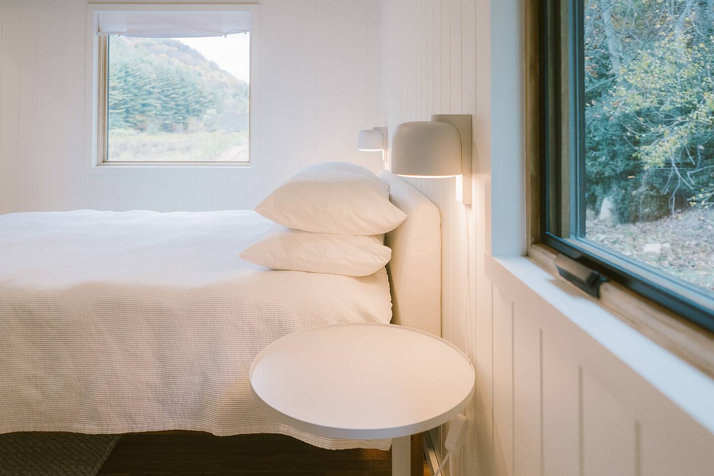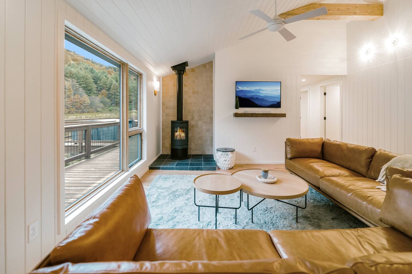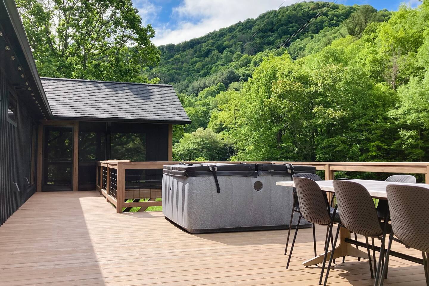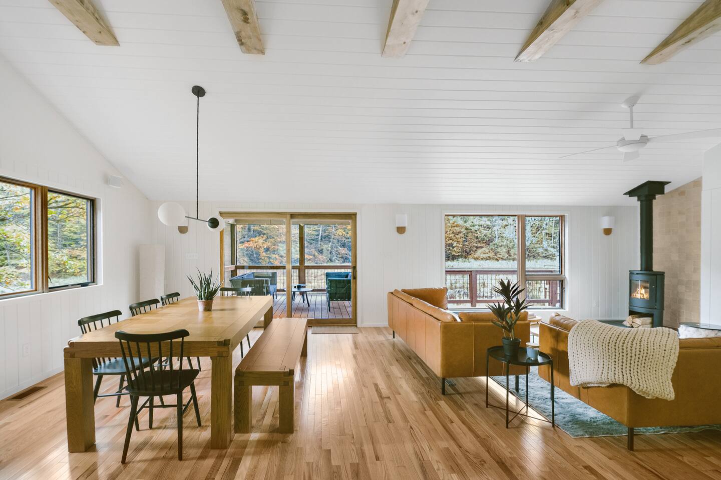 Meadow House at Wanderin Lands is a Scandinavian styled retreat designed with intention and simplicity. Fully renovated in 2022 as a getaway designed for 2 families with kids. The home is equipped with a full kitchen, extremely comfortable beds, high quality furniture, and amenities to slow down, cozy up and take in the beauty of nature all around. AT A GLANCE: 6 beds: 2 Queen, 4 twin Hot tub for 4 Barrel cedar sauna for 6 with meadow views Screened porch with sofa seating and sounds of the creek Large deck with outdoor dining for 8 Gas grill with propane provided Outdoor private shower Solo stove fire pit Deep soaking tubs in each bathroom Yoga mats (x2) and yoga blocks (x4) Laundry machines Fully equipped kitchen (w/ kids dishes, salt/pepper/oil/spices/sugar/tea) Coffee bar (multiple types of coffee makers) Induction stove Filtered drinking water Dining table seating for 8 Counter bar seating for 4 600gb Fiber Wifi Samsung gallery TV Hair dryers in bathrooms Sound machines in every room Black-out shades in each bedroom Pack n' Play travel crib with sheet Juice Box 40 EV charging station No Guest fees! LOCATION DETAILS 8 min to downtown Lansing 20-25 min to downtown West Jefferson & Jefferson 25 min to Ingles Grocery store 30 min to Grayson Highlands State Park 45 min to Boone 45 min to Whitetop trailhead of Virginia Creeper Trail 60 min to Damascus trailhead of Virginia Creeper Trail THE PROPERTY Wanderin Lands is 105 acres of land in beautiful Ashe County NC. A state maintained back country road runs through the property. Upon arrival you'll find our home accessible from a short gravel driveway directly off that road. Orchard trees and an arbor of grape vines line the driveway. Through the home, you'll take in views of our 16 acre meadow and hear sounds of the burbling creek at the treeline where the meadow rises to hillsides. Out back is a large deck and screened porch with cafe lights and outdoor speakers. The deck also houses the hot tub, barrel cedar sauna, outdoor shower, gas grill, and el fresco dining for 8. Beyond the deck is the solo stove fire pit and private A-frame cabin designed as a work/meditation/yoga space. Stretching to the west is a private grass trail that weaves around a portion of our 105 acres - out along the creek side and loops back to the house (about a .5 mile walk in all). THE HOME We appreciate the simplicity of Scandinavian design with its cozy minimalism to bring peace to the mind and refocus on the beauty of the surroundings. Thoughtful views from every window, dim-able lighting in every room, and comfortable furniture nurture rest and relaxation. Inside, our home provides multiple open areas to gather if visiting with family or friends, as well as private spaces to be alone and reflect. LIVING SPACES We have an open floor plan connecting our kitchen/dining/living spaces. Our fully equipped kitchen with island seating for 4, overlooks a large dining table for 8. The adjacent living space has two supple leather sofas that orient to views of the meadow and hillsides. When not taking in the views, our Samsung Gallery TV allows for streaming from all popular apps. Beyond the dining area through the glass sliders is our screened porch with 2 additional sofas for relaxing, reading or napping (our favorite). The porch and deck are outfitted with speakers and cafe lights. Enjoy soft tunes or the burbling sound of the creek while taking in the sunset or wildlife (red-winged blackbirds & deer) over the meadow. Occasionally you will also catch the sound of cars passing on the nearby road that carves through our 105 acre property. ROOMS All bedrooms have bright natural light in the daytime and blackout blinds for great sleep. Each room also includes dim-able lighting, ceiling fans, USB plugs, a sound machine with 10+ sound options for lulling to restful sleep. All rooms are purposely TV free and outfitted with plenty of storage — A closet in all bedrooms, dresser in each primary room, and cubbie cabinet in each bunk room. Beds were chosen for extreme comfort – Many of our reviews confirm this! Room 1 - 1 Queen Primary en suite with a private bathroom & deep soaking tub. Views to the southwest over deck, meadow, & mountainside. Room 2 - 1 Queen Primary en suite with private bathroom & deep soaking tub. Views to west over A-frame cabin and meadow. Room 3 - bunk room, 2 twin beds Cozy built-in twin bunks designed for kids with special nooks. In the closet you will find a Pack n' Play with crib sheets for your convenience + yoga mats and yoga blocks. Room 4 - bunk room, 2 twin beds Cozy built-in twin bunks designed for kids with special nooks. Designed by our friends, design-duo Jammy Pop, so much love and attention has been poured in to this space and we're thrilled to share it with you.