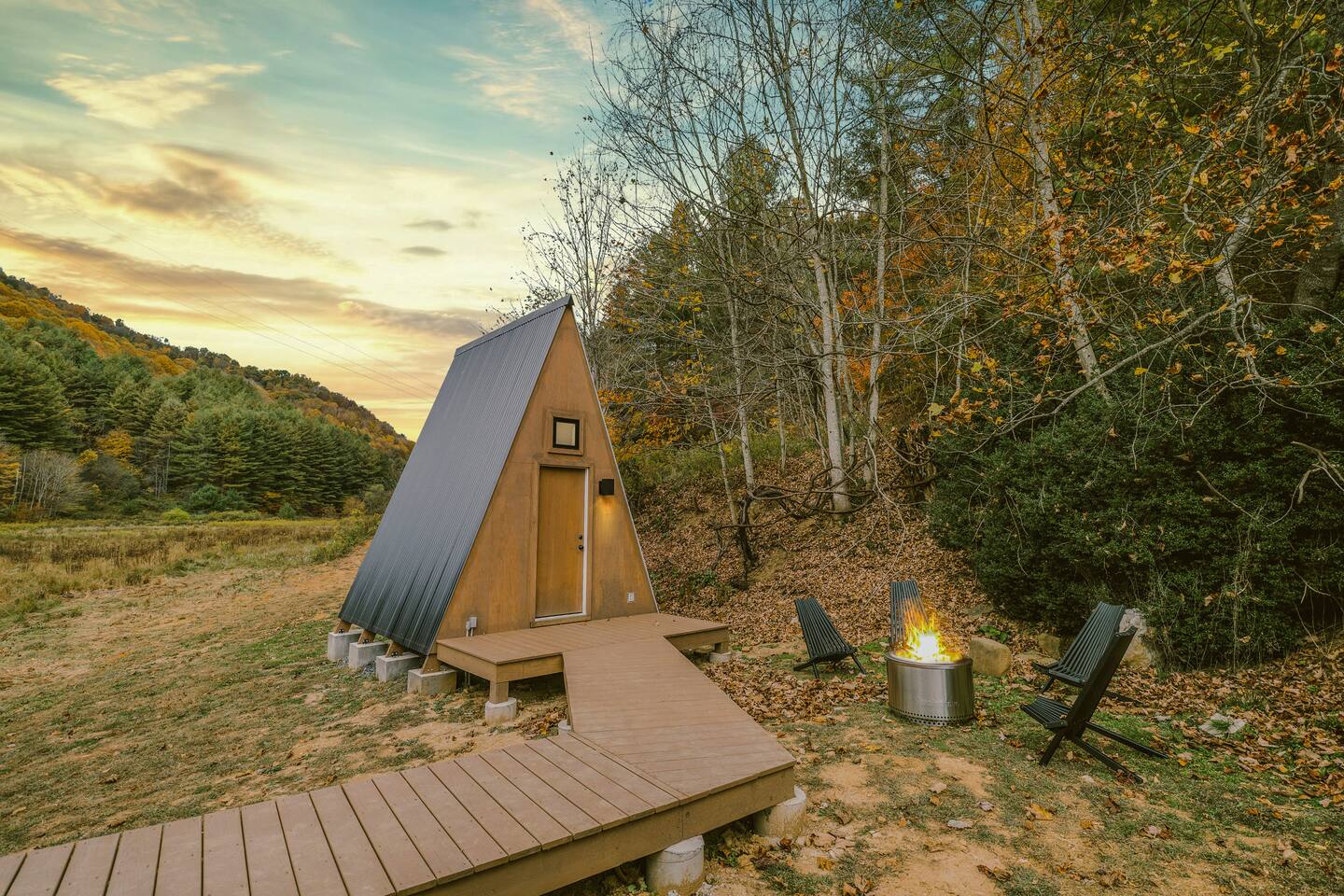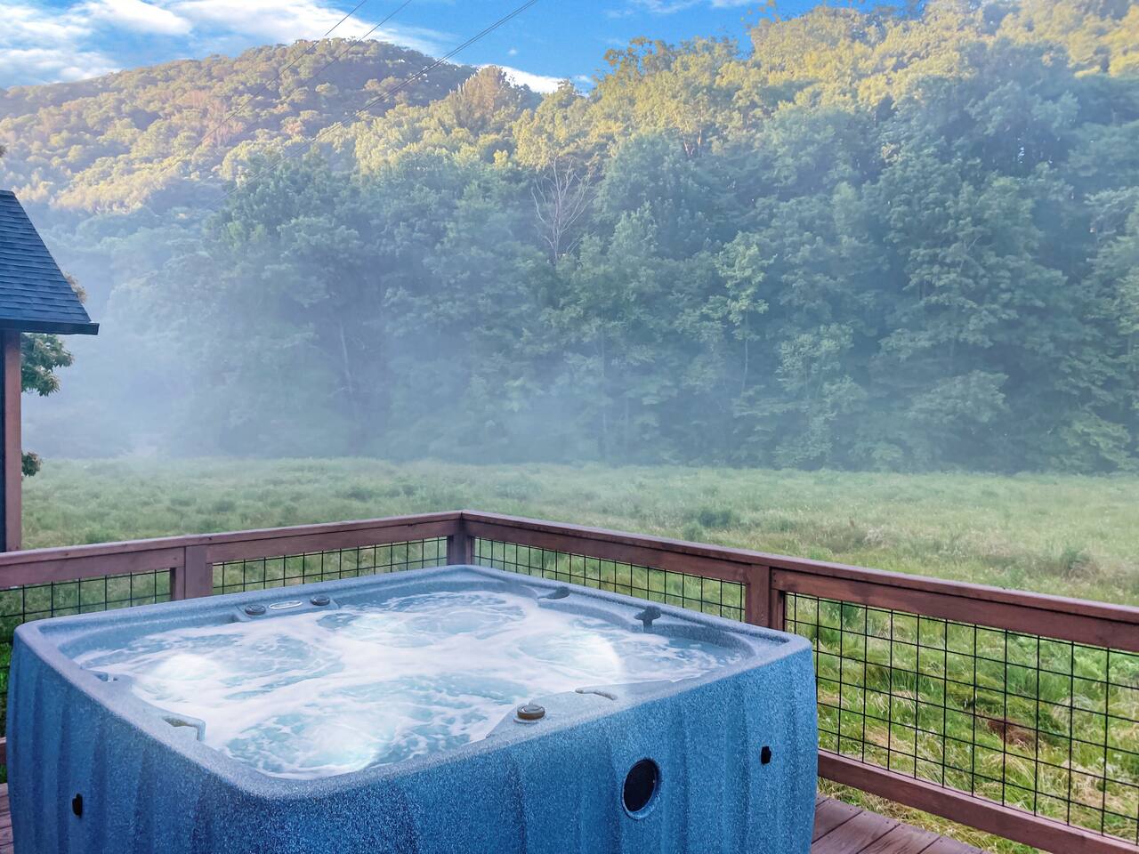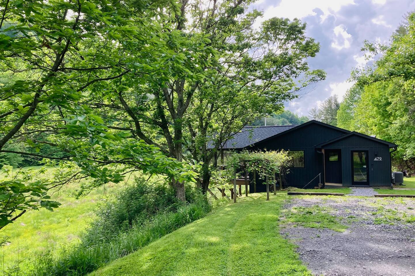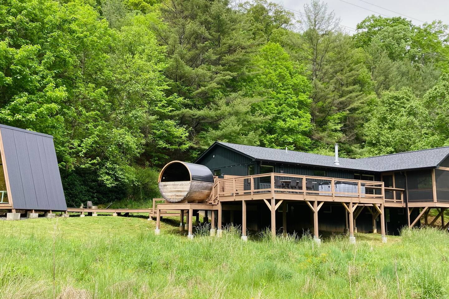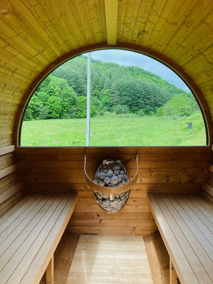 105 acres in the far NW edge of NC. Enjoy the hot tub, cedar sauna, large deck with screened in porch, fire pit, private walking trail & nearby creek + EV charger, an no guest fees. Nestled between 2 mountain ridges of Ashe Co. and overlooking a 16-acre meadow, Wanderin Lands' Meadow House + separate work/yoga A-frame, is designed as a retreat suited for up to two families with kids, small groups or couples. Close to Grayson Highlands (30m), W Jefferson (20m), DT Lansing (8m)